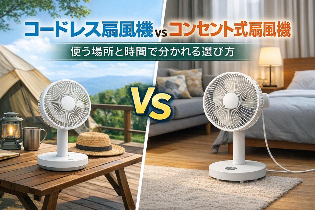 扇風機を探していると、最近はコードレス(充電式)とコンセント式の2タイプを見かけます。 どちらも同じように風を送る家電ですが、実際には使われる場面や想定されている役割が異なります。 この記事では、家の中での使われ方、連続使用時間の目安、メー... -