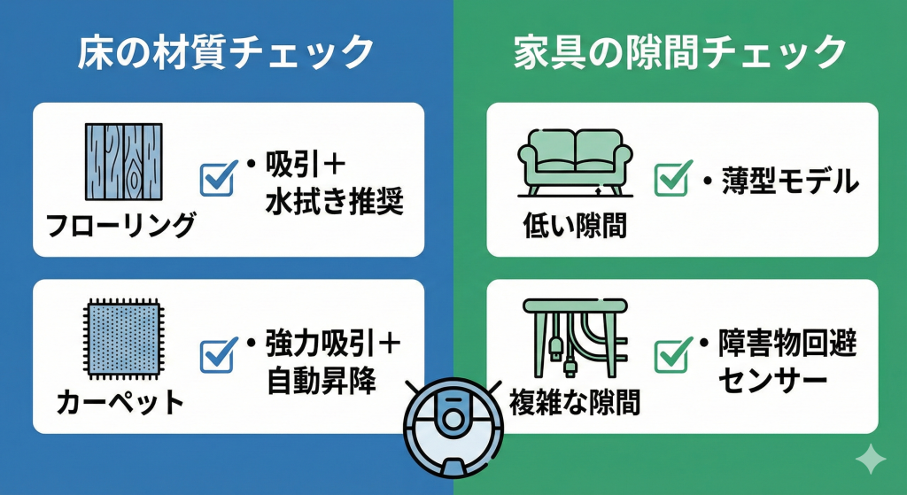 ベッドやソファの下が8cm以下の場合、従来のモデルでは進入できません。隙間の高さを測ることで、選ぶべき機種が絞られます 。